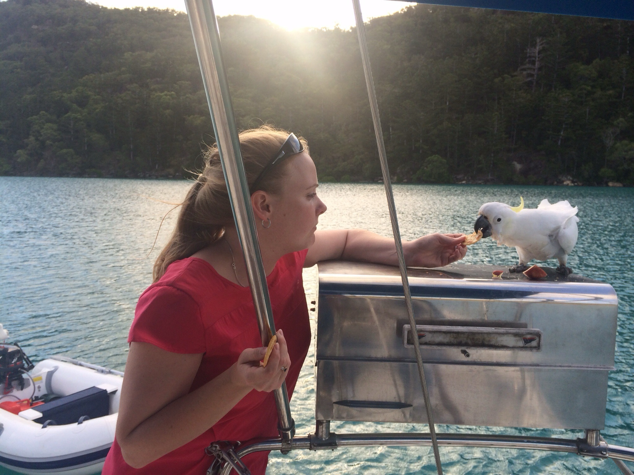 Sarah makes friends with a cockatoo at Nara Inlet