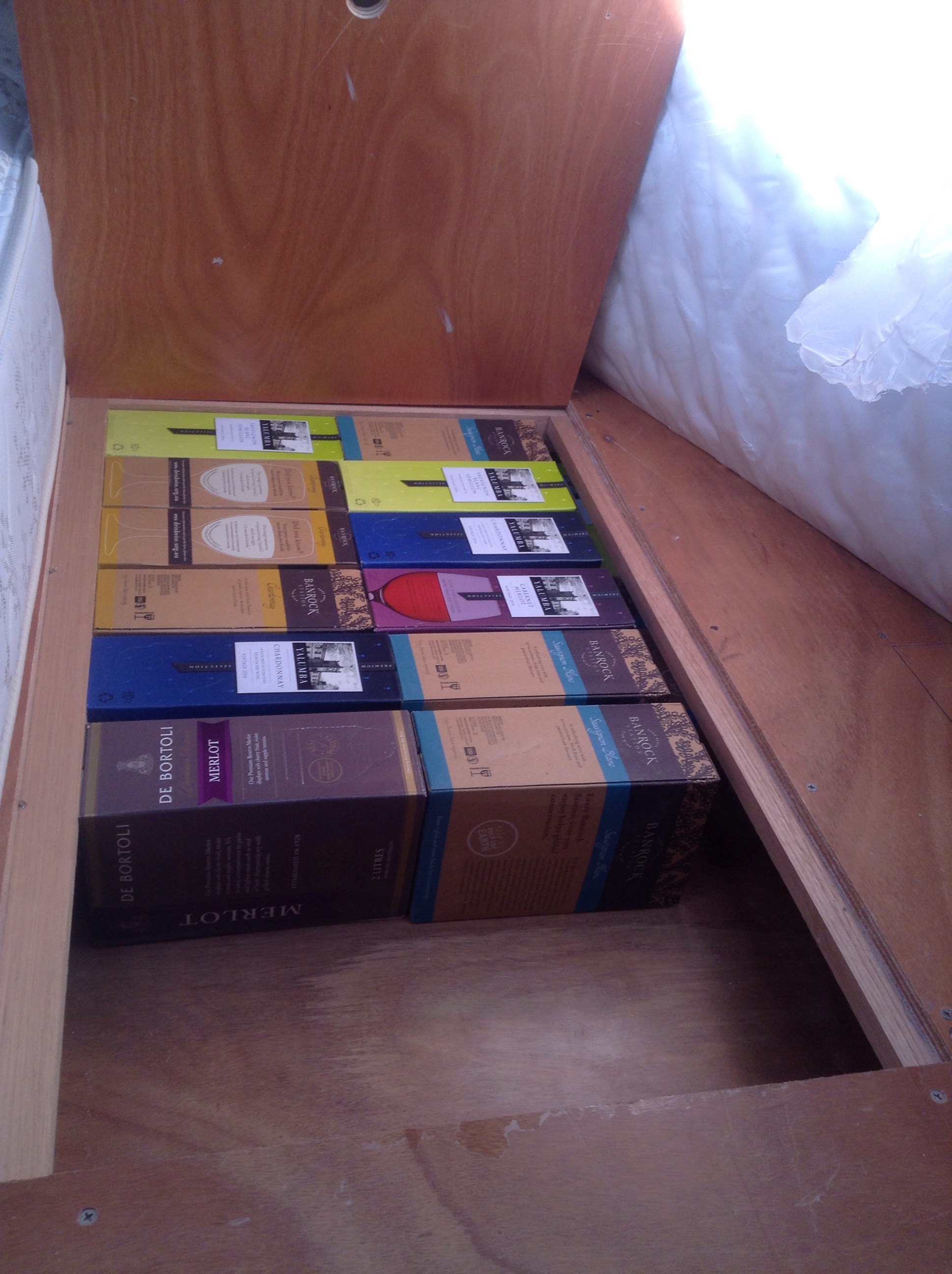 Our wine stash under the mattress in Bali Hai