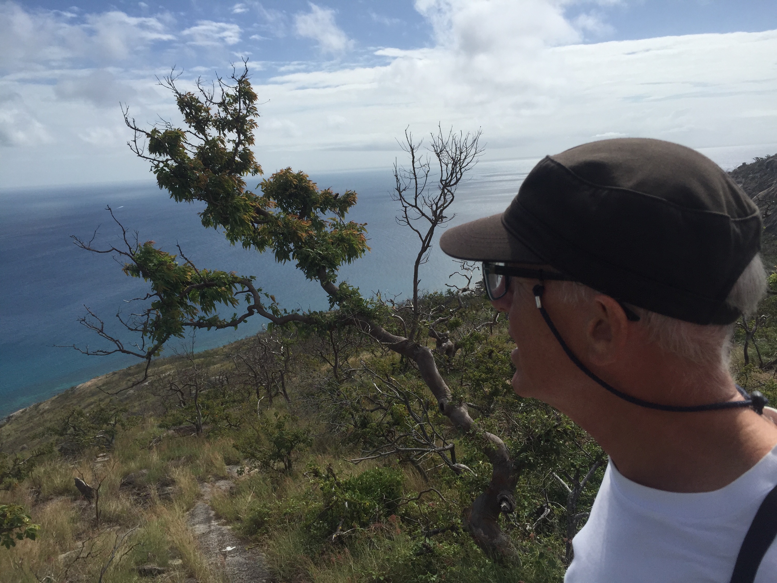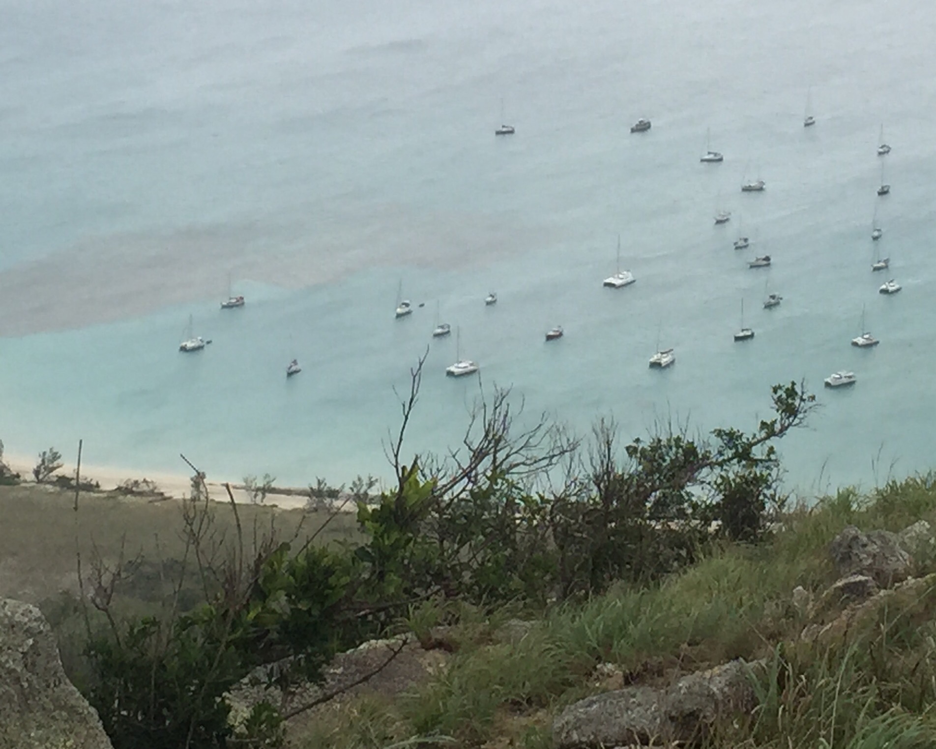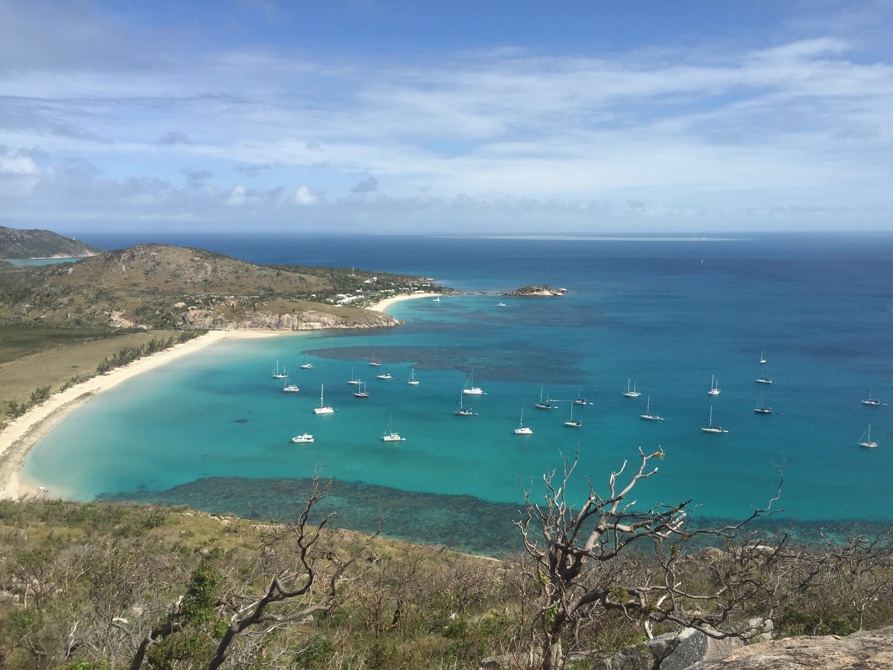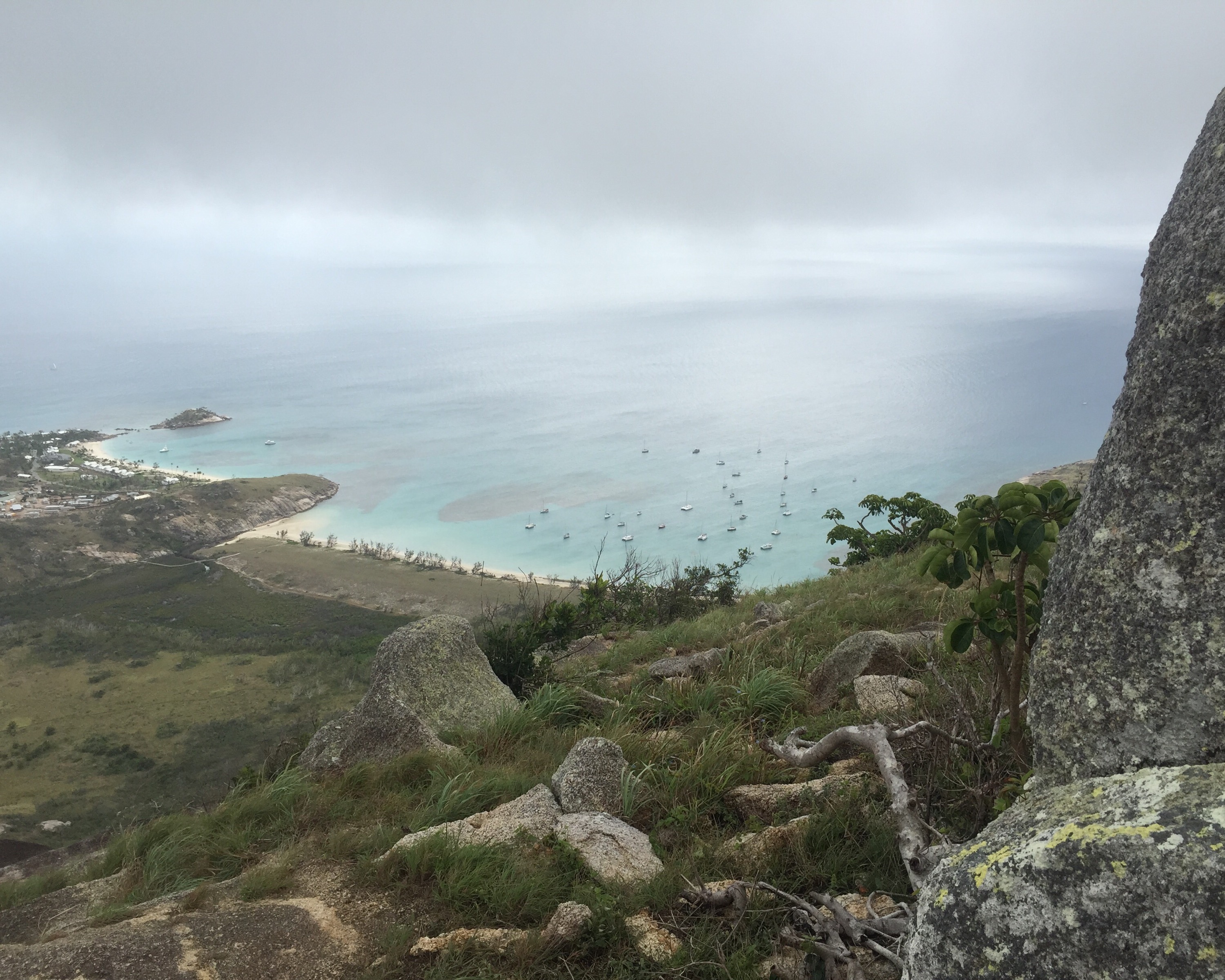 Looking out at the Barrier Reef and One Mile PassageHalf way up the steep climb on a sloping ledge of rock, Telstra users were able to receive a telephone/ Internet signal. Crouched on the rock, yachties of all shapes and sizes were bent over their lap tops, iPads and phones busy texting, emailing and talking to family, friends, insurance companies, and trades people. All getting their last communication “fix” until we arrive at Thursday Island in a week or ten days time.