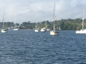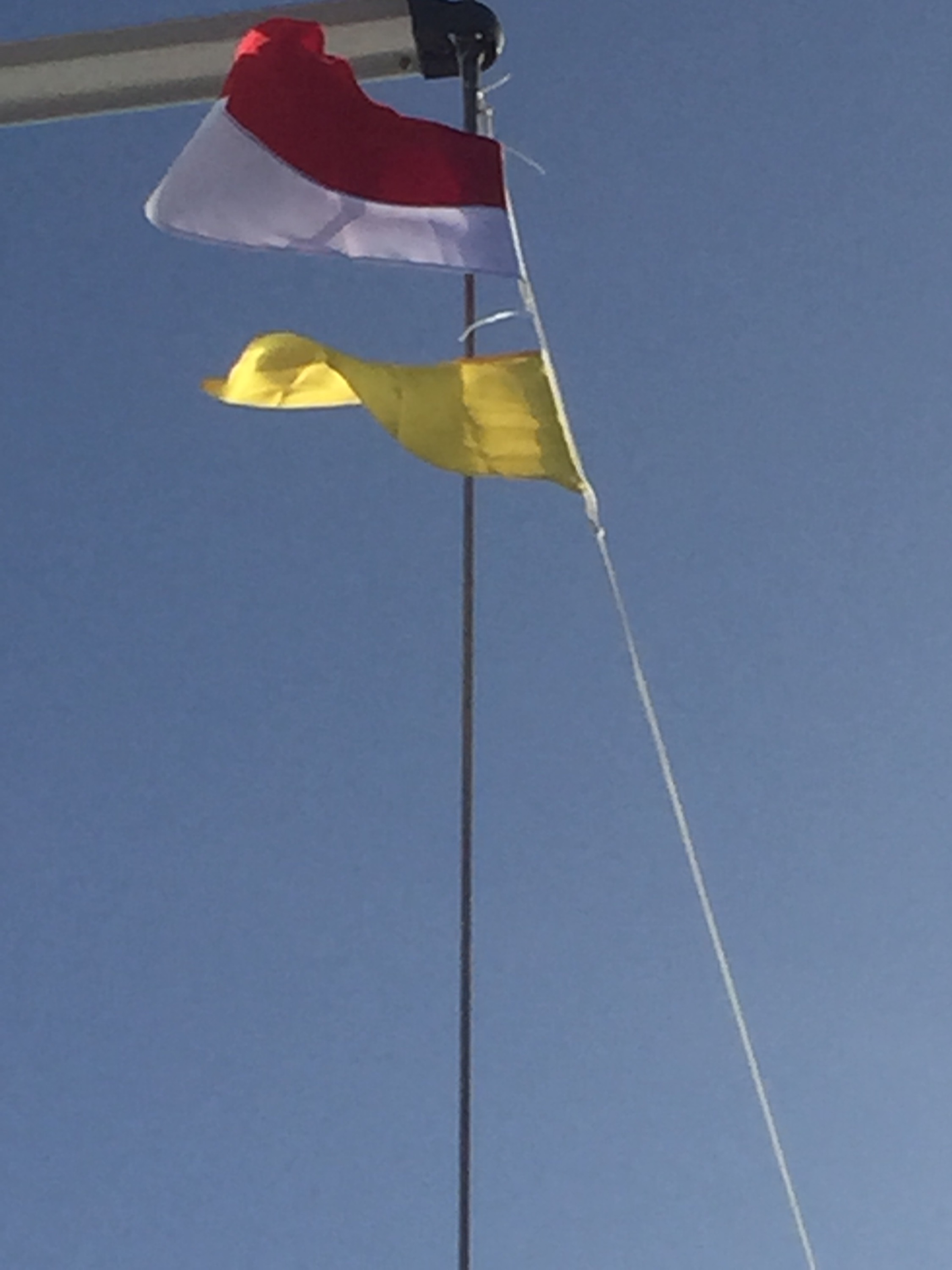 Rally boats at anchor in Debut IslandBefore we arrived we had hoisted the traditional yellow “Q” flag to indicate we needed to clear Quarantine and be declared healthy. On top of the “Q” flag we hoisted the Indonesian flag – red on top of white – both on the Starboard spreader.