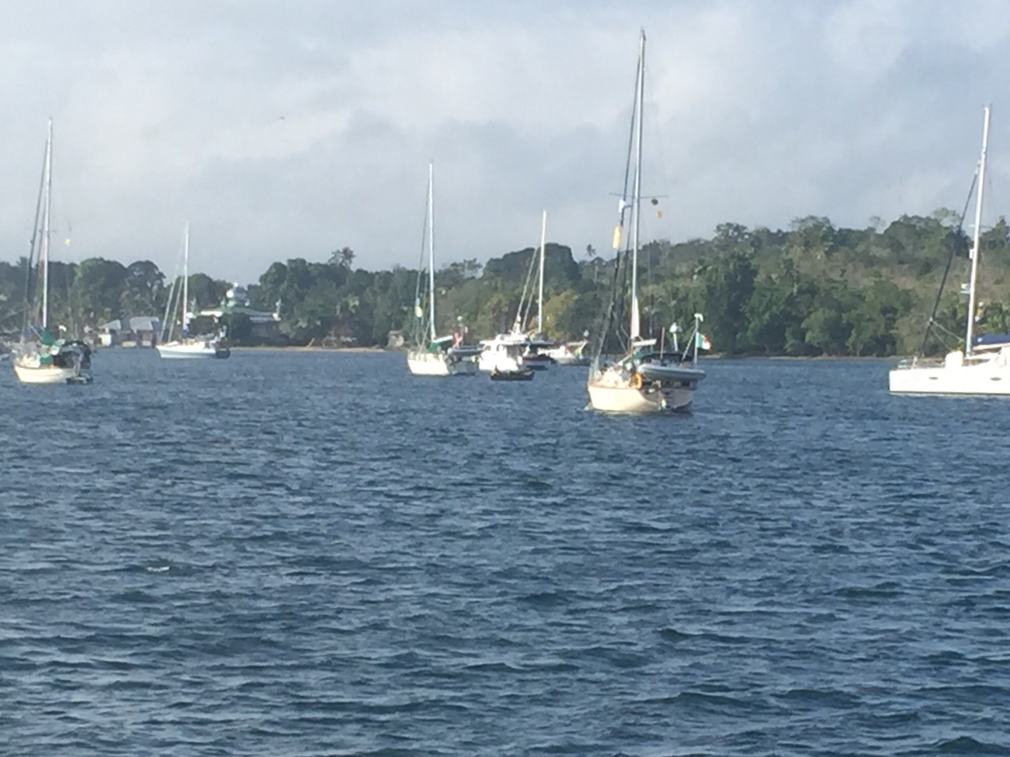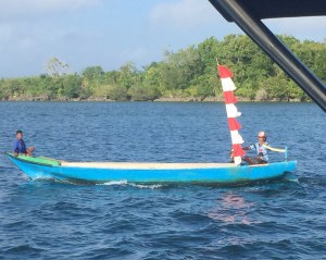As we arrived at 7 am, a flotilla of dug outs and fishing boats propelled by what sounded like unsilenced lawnmower engines and decorated with colourful flags, greeted us and literally ushered each yacht as it arrived to a spot in the anchorage.