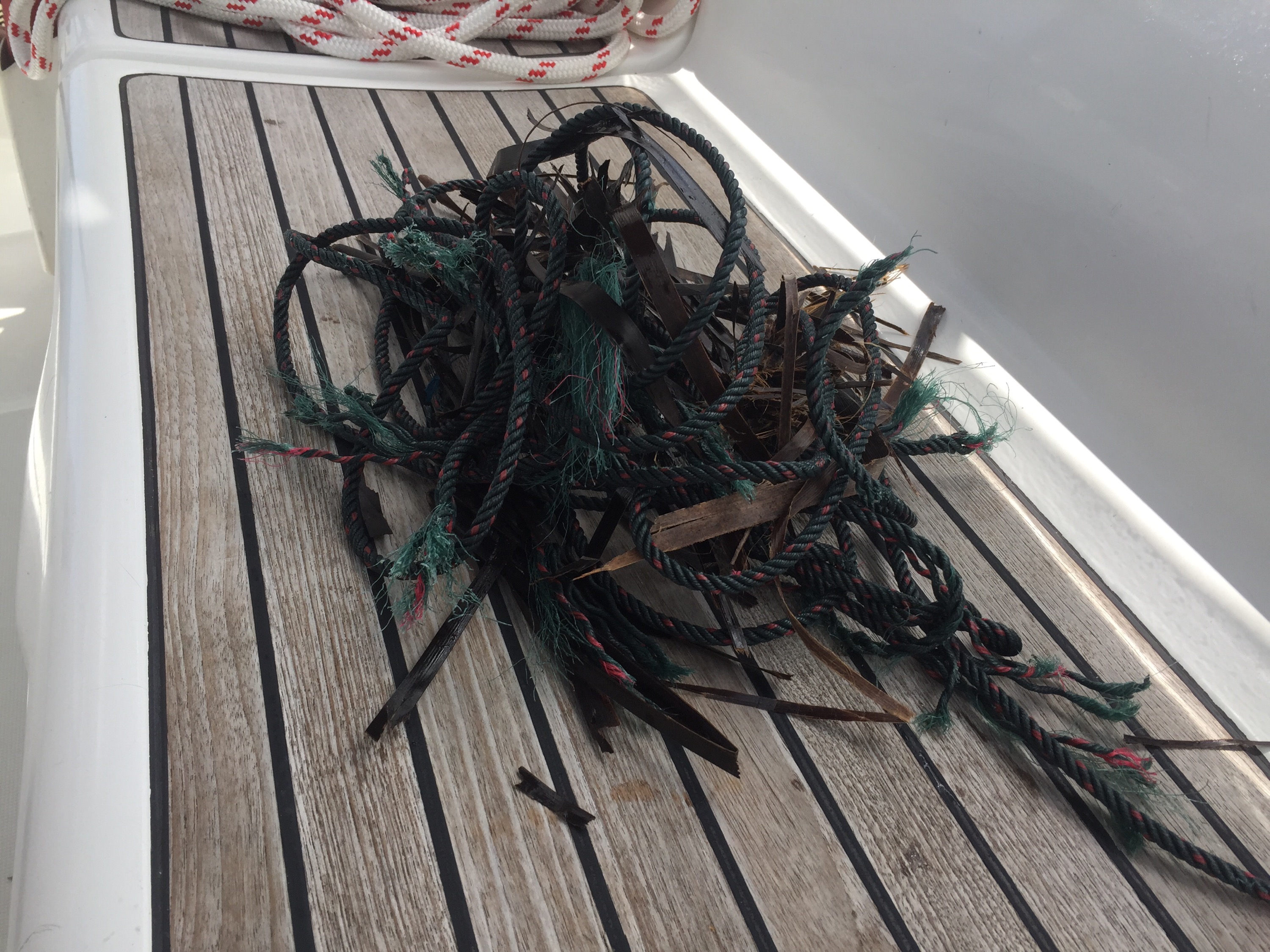 Just some of the rubbish caught on our propThere was thankfully, no damage although the rope cutter not surprisingly, was loose. Another kind gesture was offered by Gerrit and Annemieke on Fruits de Mer – the loan of a “hookah”, a diving respirator attached to a long line with a small generator that pumps out air.