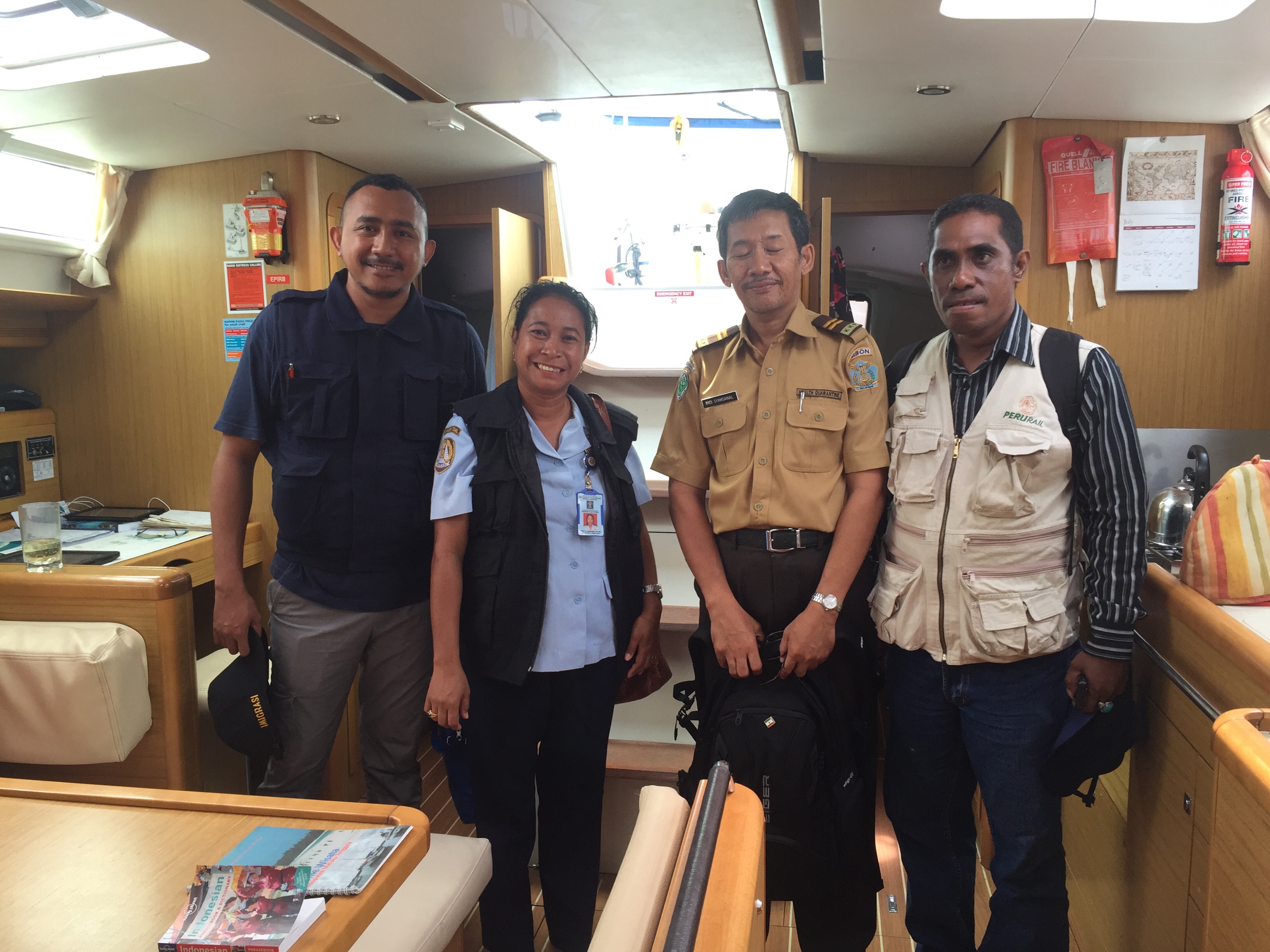 A while later four people from Quarantine and Immigration services arrived and papers were duly exchanged and stamped (we have to have a ship’s stamp to add to the melee of stamps), passports perused and there were handshakes and photos all round.