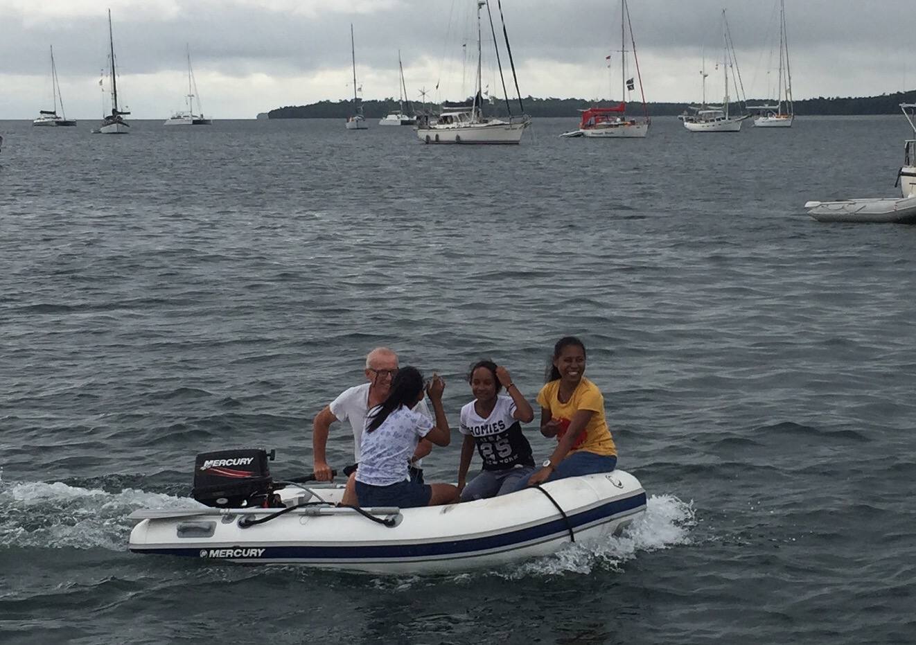 Three young girls, two 13, one 17, hopped off their boat and came and had a look at Bali Ha. Then they wanted a ride on the dinghy, and Jonathan took them for a ride around the bay.