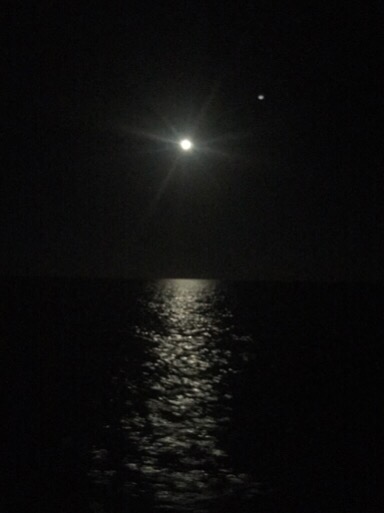 The passage was mostly uneventful – the seas were gloriously calm, we had a bright, almost three quarter moon and more wind than we were expecting although we did have to turn the motor on in the early hours.
