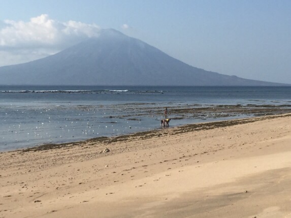 A candidate for find Indonesia’s next top model contest?As we walked along the beach we were able to get a better view of what the many people on the beach were doing – they were tending their seaweed farm. The weed grows on fishing line stretched line after line across the bay and kept afloat by plastic bottles.