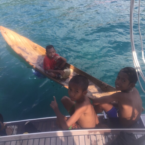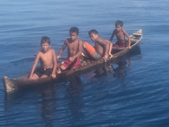 The boys came alongside in an array of leaky canoes (some with enormous holes in). I think they must have “borrowed” them as they had no proper paddles and some had nothing to bale with.