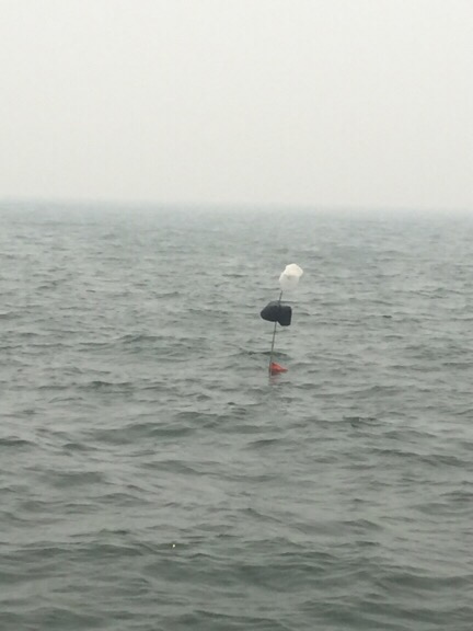 Unusual channel marker – two plastic bags on a stick!The intention was to anchor out in the bay until late afternoon before we set sail for Karimata. If we left too early we would arrive at Karimata in the dark. As it turned out, it was so unpleasant bobbing up and down in the smoke filled atmosphere we ended up setting off more or less straight away and then anchored for the night at a small island called Pelubang before departing for the final leg to Karimata.