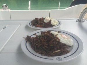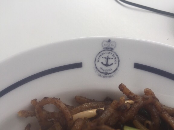But wait, one of the crew had his hands full – it very much looked like plates of food! Next minute, two white China plates resplendent with the Malaysian Navy crest and piled with noodles topped with a fried egg were being passed up to us.