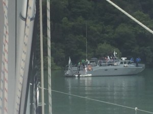 The next day we had a slow start and were enjoying our second cup of tea in the cockpit when our isolation was once again interrupted – this time by a naval launch.
