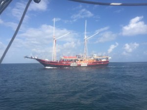 One of the prettier tourist boatsAs we approached a guy started yelling and gesticulating, telling us in no uncertain terms that we weren’t to land our dinghy on the beach. Not a welcoming kind of experience!