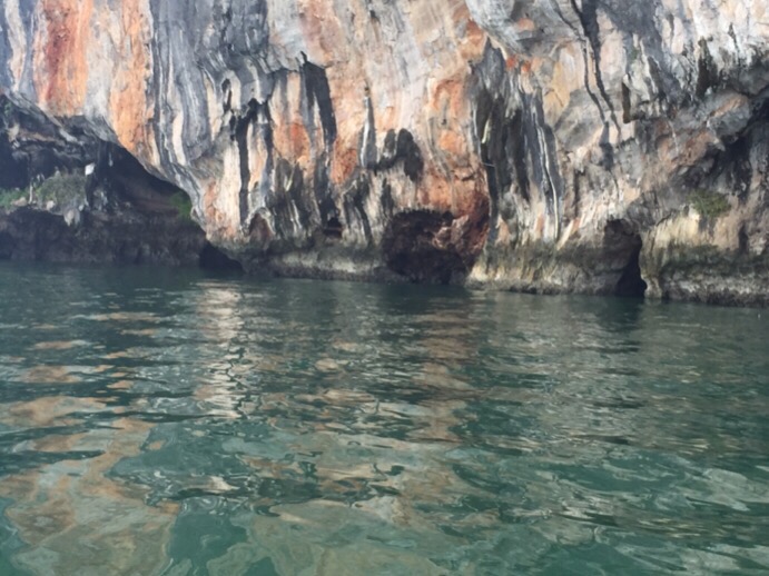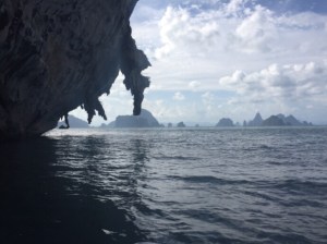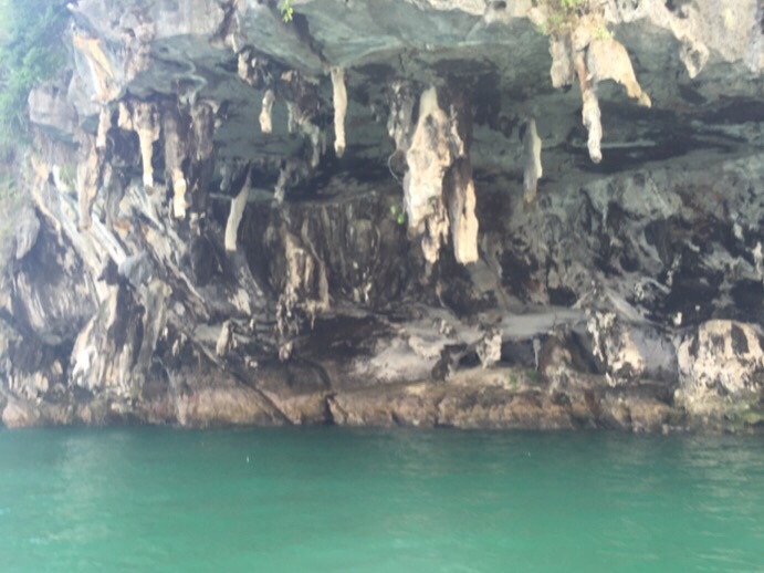 We were particularly taken with the stalactites and stalagmites (remember tights go down and mites grow up) that hang and grow right on the edge of the rocky outcrops of Koh Phanak and other islands. Stunning.