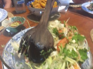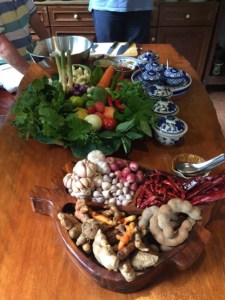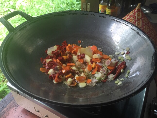 Such vibrant colours!We learned how to cook five main dishes – beef mussaman, a yellow curry, a chicken stir fry, a soup, a beef larb (salad) and then a strangely delicious dessert made from sweet potato and fresh coconut milk.