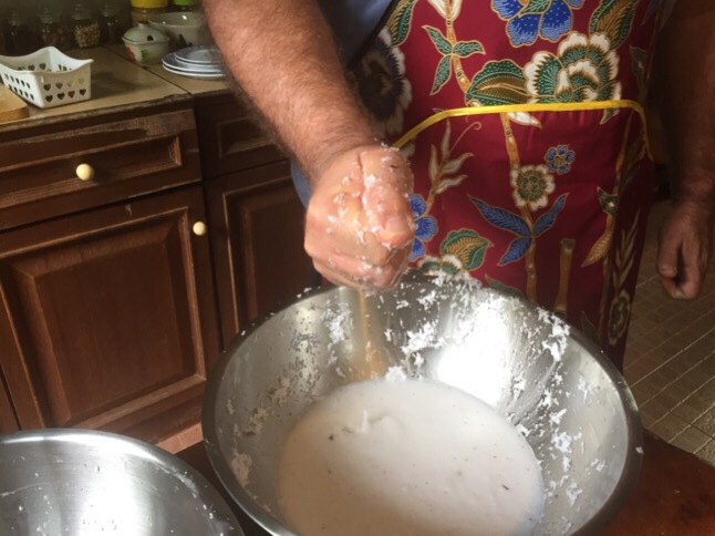 Squeezing the coconut flesh to make coconut milkEventually everything was cooked and we sat down to a delicious meal in Mina’s kitchen.