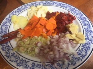 Preprepared spices – lemon grass, ginger, galangal, garlic, onion and chillies