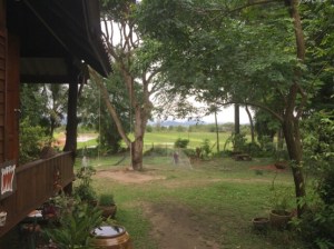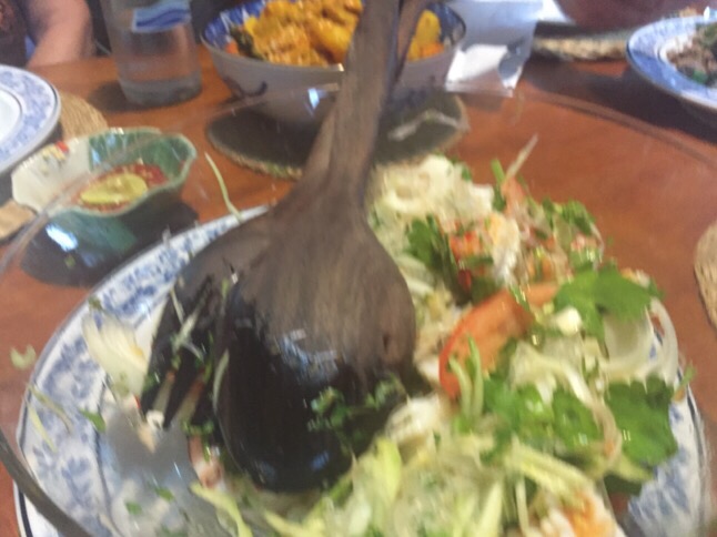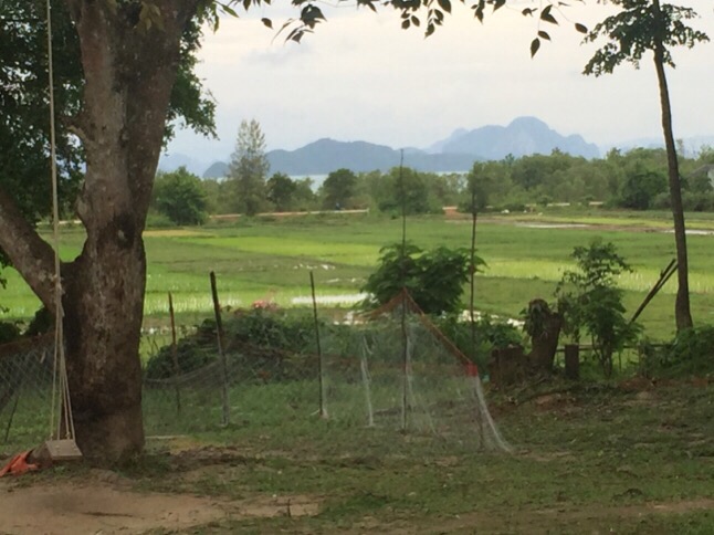 The view of paddy fields and the sea in the distance at Mina’sSo early afternoon we piled in a tuk tuk and were driven to Mina’s house perched on an incline with a view of paddy fields leading down to the sea and surrounded by gardens full of vegetables and fruit trees and inhabited by a flock of plump and fine feathered hens.
