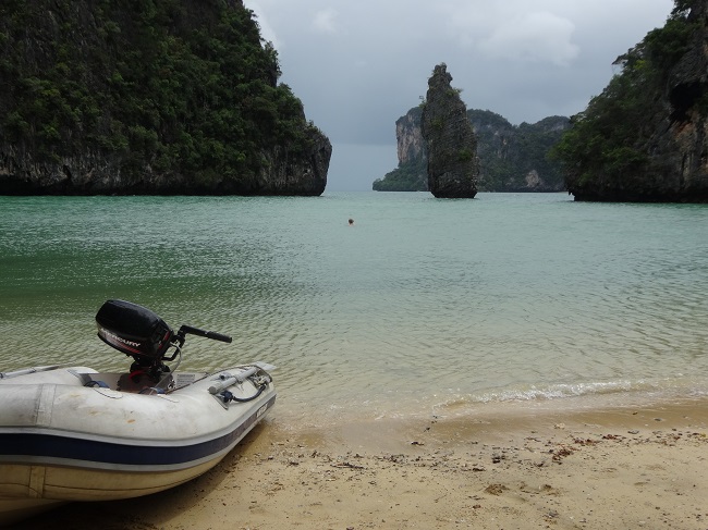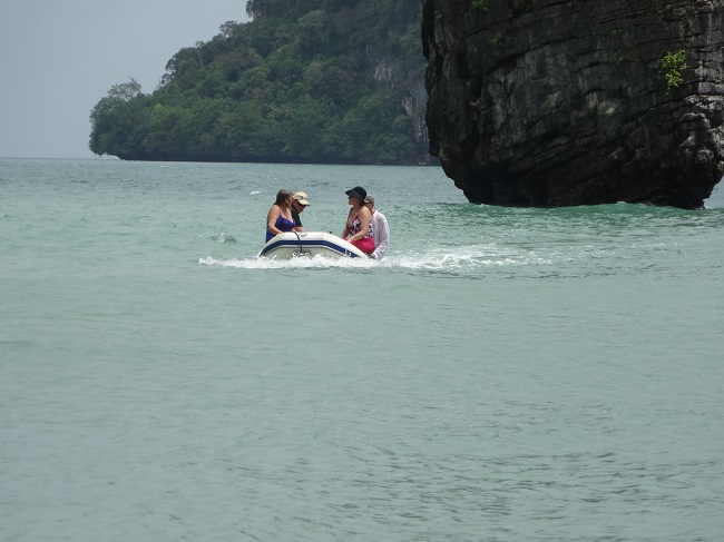 There is an excellent anchorage in a channel nestled between Koh Kudu Yai and Koh Kudu so that’s where we decided to have a lunch stop. But before lunch, we decided to go and look at Tilda’s Hong and our trusty dinghy made two trips to transport the six of us over there.