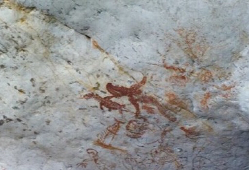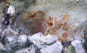 More cave artThe curious thing about them was that they were on the ceiling of an overhanging rock at the water’s edge which at first glance seemed a strange place to paint. But of course, when the paintings were done, the caves could have been a long way from the water and would have had floors that must have worn away over many thousands of years.