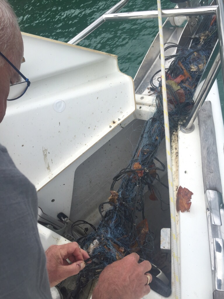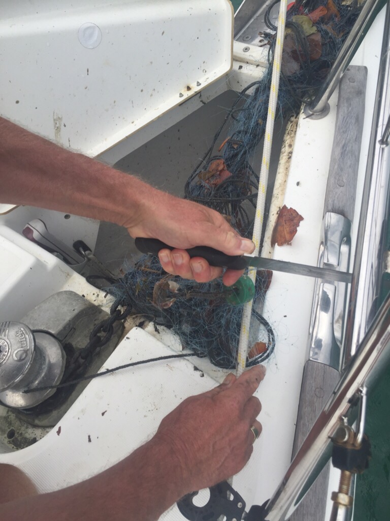 Out comes the knife!It took quite a long time to disentangle ourselves and we felt dreadful that we had to cut through and destroy someone’s fishing net but we were absolutely stuck and there was nothing else to be done.