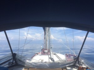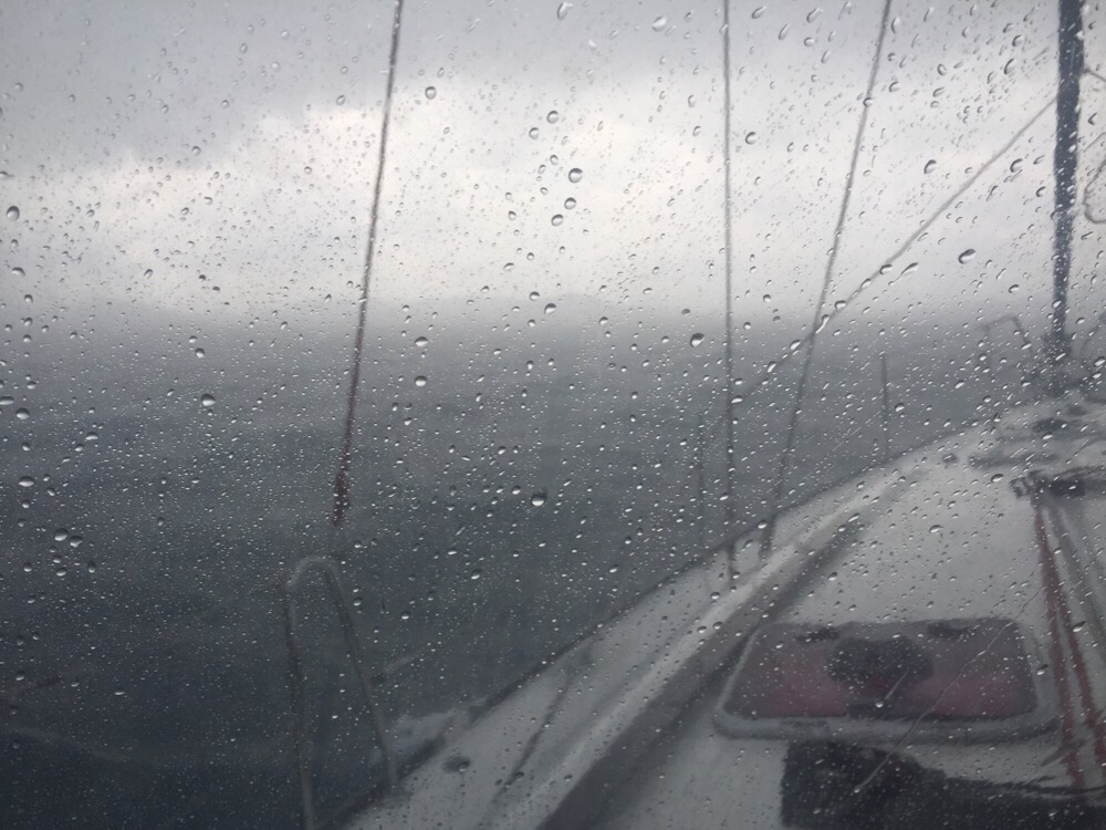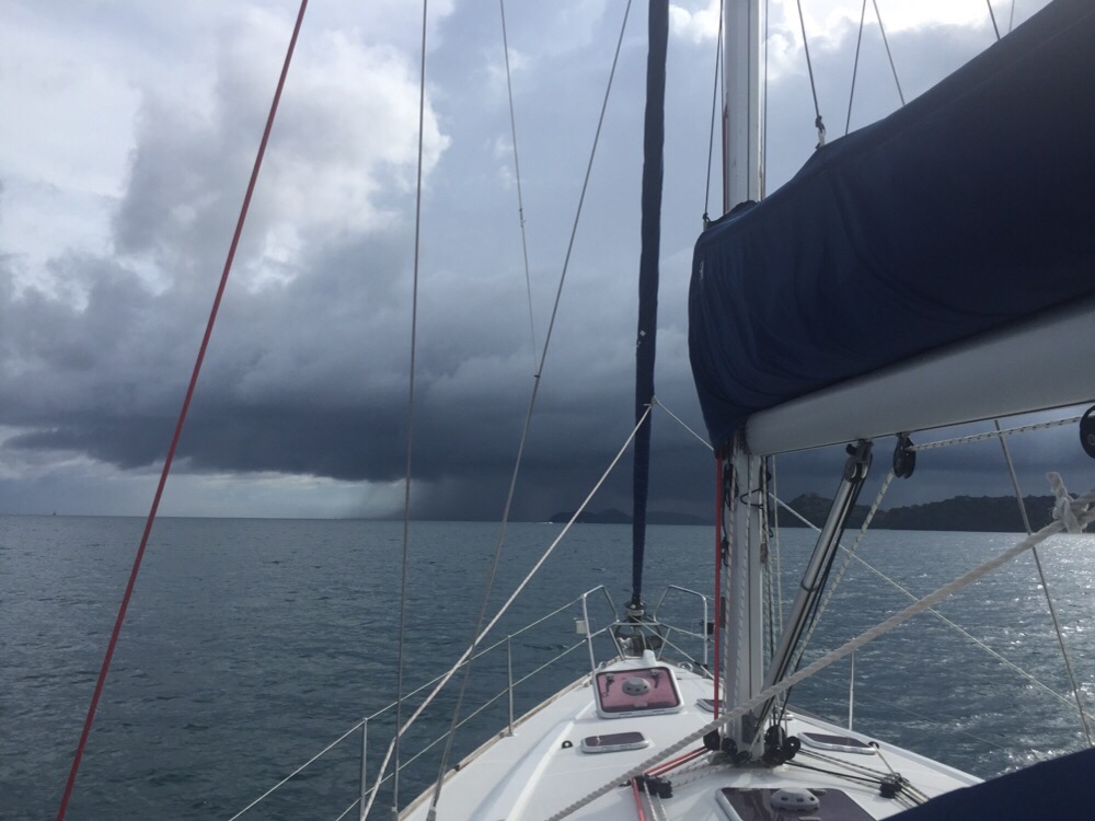 Big storm coming, reduce sail now!!We broke the golden rule and didn’t reduce sail when we first thought of it. Our thinking was that the storm would probably only last ten or fifteen minutes tops. How wrong can you be? More than an hour later (by which time we had put a reef in the mainsail and shortened the headsail) it was still raining cats and dogs as we headed into Ao Chalong. Nothing was broken but we will take more care next time.