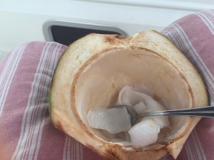 Rocky drained off the coconut water which was deliciously cold as the coconuts are stored on ice. Then he worked the flesh loose for a delicious snack.