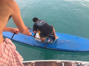 After anchoring we dived in for a cooling swim and just as we were drying ourselves we received a visitor who arrived by kayak with a lovely bunch of coconuts and a rather fearsome looking cleaver attached to his belt.