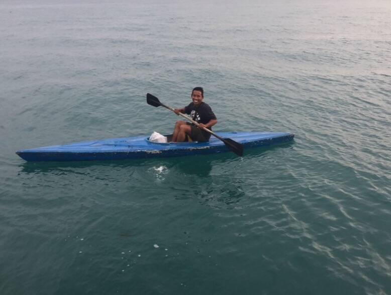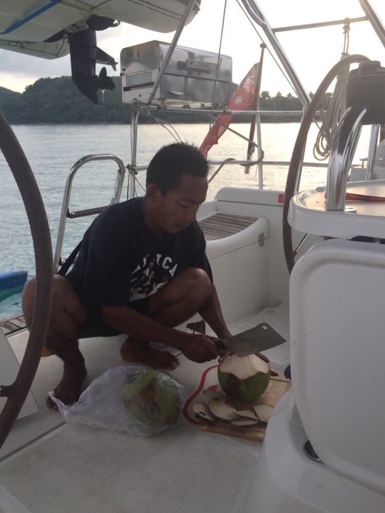 After anchoring we dived in for a cooling swim and just as we were drying ourselves we received a visitor who arrived by kayak with a lovely bunch of coconuts and a rather fearsome looking cleaver attached to his belt.