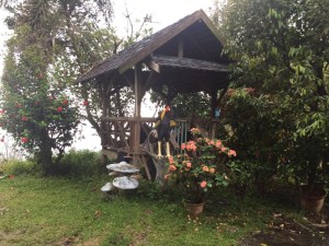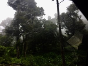 The road looked very narrow so we were a bit dubious and soon we were sloshing about on what appeared to be a farm track (we did drive past a poultry farm) and then we started to climb higher and higher up the hill. At each bend the possibility of there being an open restaurant at the top seemed less and less likely. We felt like we were on a movie set – think Rocky Horror Show or even Pyscho! There was driving rain, thunder and lightening as we climbed further and further up into the clouds.