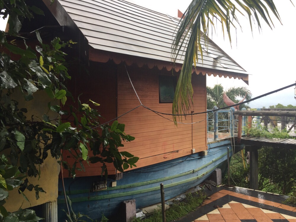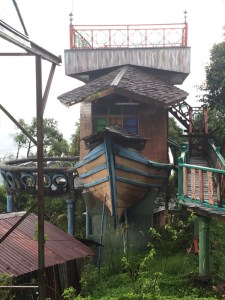 After the clouds had parted – magnificent!We were also able to stroll through the eccentric grounds where dilapidated boats perched precipitously on the cliff. These boats had been built up and used as rooms for the now defunct (I gathered) hotel.