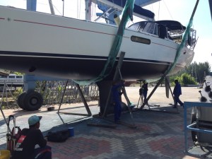 Bali Hai is lowered into the waterEverything went smoothly when we put Bali Hai back in the water – even the docking process at the marina was without incident. Must be getting better at this boat business!