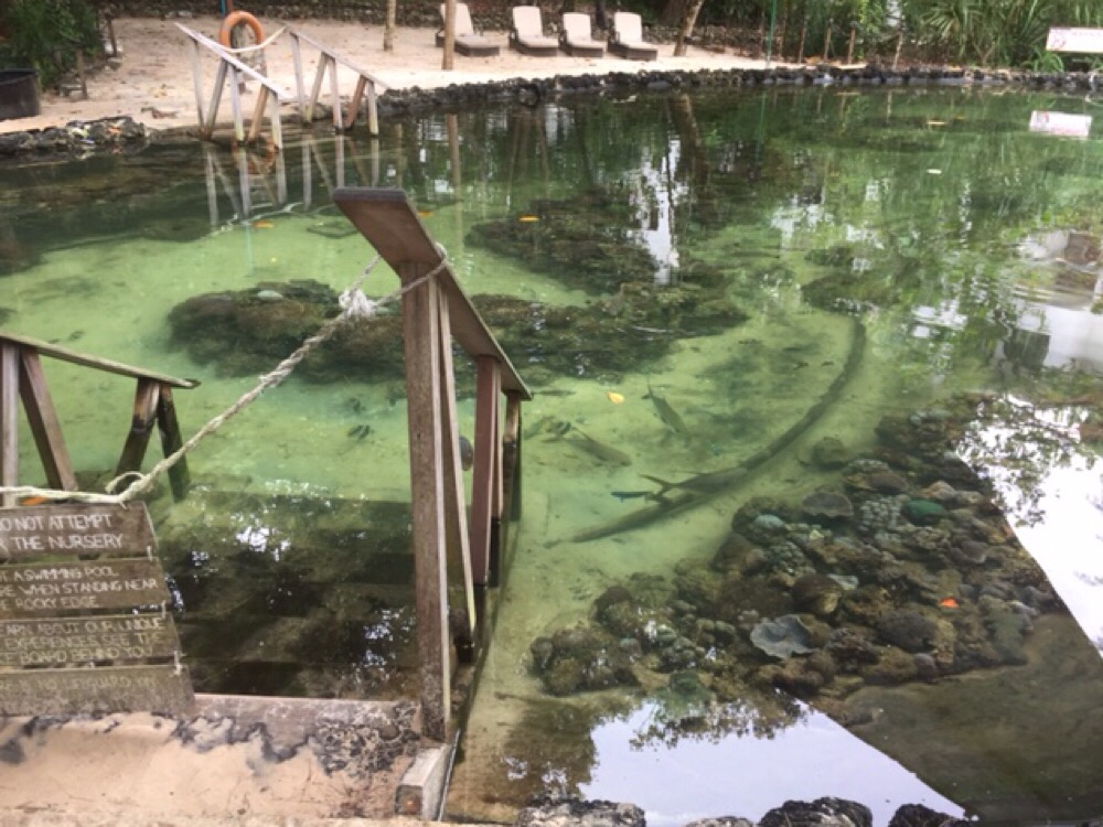 Enjoying a cold beer at the beach barWe walked to one end of the beach and decided to go in search of a cold beer – the Andaman Resort looked very inviting so we wandered round the swimming pool area and then through a stand of trees where we came upon another pool. This time instead of clear, clean water against an azure background, the water was cloudy green and mossy. It soon became apparent that it was a pool for fish and corals and not for people.
