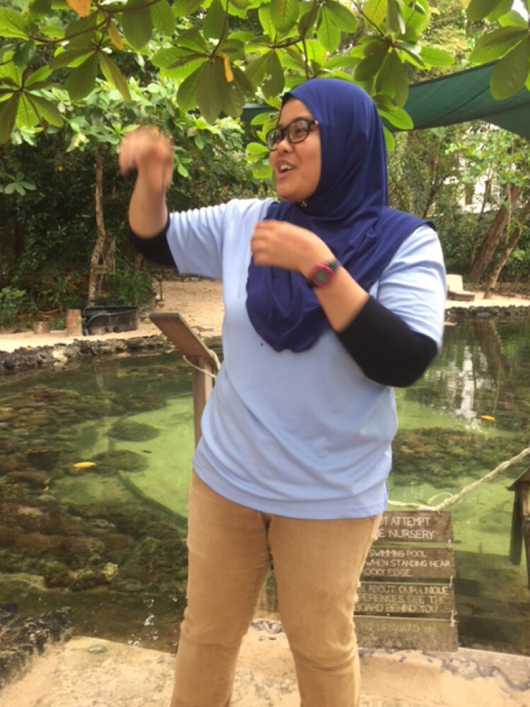 The green and mossy poolWandering round it we came across the delightful resident marine biologist who took great trouble to tell us all about the pool and its inhabitants, about habitats and food, the types of coral and the habits and types of fish.