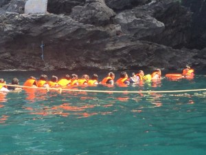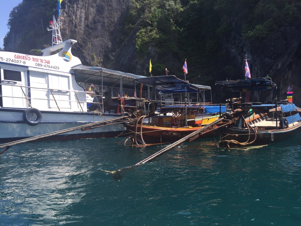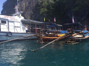 The tourists lining up in a “crocodile” to enter the Emerald CaveWe returned to Bali Hai and headed for Koh Phi Phi where we were going to anchor for the night. On the way we were delighted to see dolphins for the first time in ages. They seem very shy in SE Asia and typically don’t play around the boat’s bow wave or swim alongside. Nevertheless, it always makes you feel happy when you see them!
