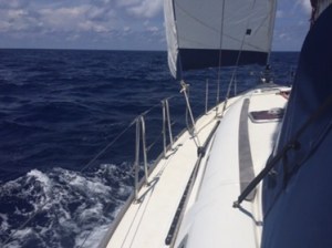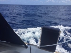 At 7.30am we put the sails up and had a wonderful sail. The wind was around 13 – 15 knots and even with the headsail deeply reefed and the main sail also reefed (made smaller) we were averaging around 6.2 knots – that’s with a current against us! We took in a bit more headsail and settled down to 5.5 knots as we didn’t want to go too fast and get to Port Blair in the middle of the night.