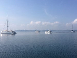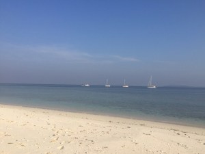 Our small fleet enjoying the beauty of Elphinstone HarbourSo it was with reluctance that we departed for Long Island, the next stop we had included in the itinerary we had handed into the Harbour Master at Port Blair. As we motored past Guitar Island we marvelled at the stunning, empty and isolated beaches. Paradise!