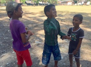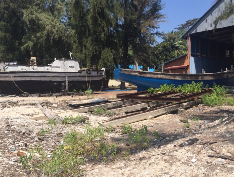 Excited and very giggly boys.There were quite a few empty dwellings and we wondered if they had been abandoned after the tsunami. There was a Boat Yard with a couple of small craft in the process of being built but what had once been an impressive slipway was now badly damaged.