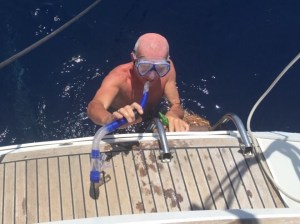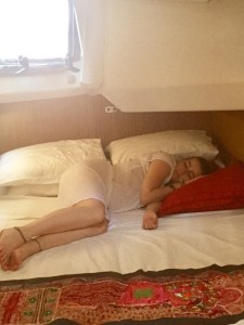 Fast asleepShe didn’t hear the change in engine tone as a wayward fishing net wrapped itself round our prop shaft about an hour and a half out. She didn’t hear a thing when we put the engine in neutral and lowered the dinghy. Nor did she awake to the sound of her Dad doing his Bear Grylls impersonation, jumping over the side with goggles on and a large knife in his hand..nor did she hear him dive down five times before freeing the offending net from the prop shaft!