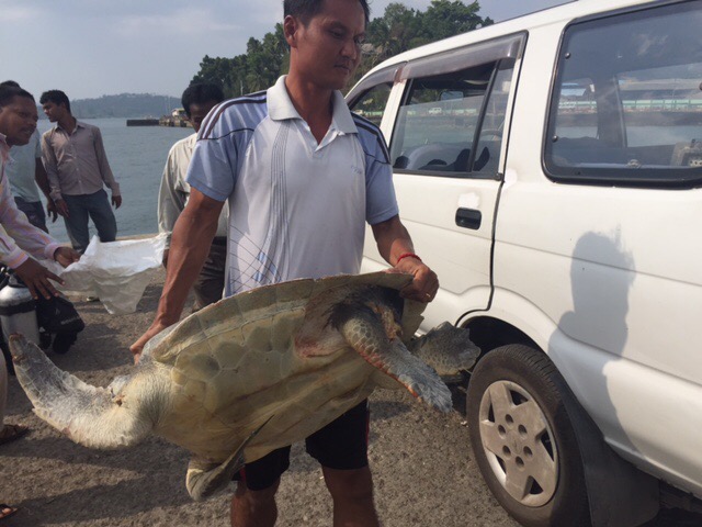 Marine Police at Port Blair taking a sick turtle to “the doctors”