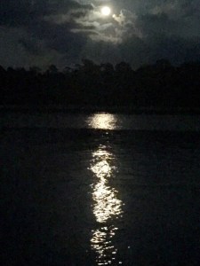 The sun set over the water about an hour before we arrived at our anchorage but it remained light for some time afterwards and before too long we were treated to a most spectacular moonrise. We were in awe as we watched this huge blood red orb slowly emerging from hiding.