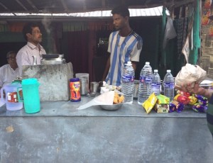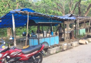Pop-up food stalls serving breakfastAt the convoy checkpoint makeshift stalls were set up selling fragrantly scented hot chai, vegetable pakoras cooked in vats of hot oil and stodgy doughnut rings which even the hordes of dogs playing around the parked cars, trucks and buses refused to eat.
