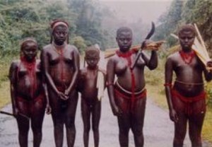 This group is very like the group of women we saw (stock photo)Further along we met an old man with a bow and a spear and a bit later as we slowly crossed a rickety bridge, three young men wearing coloured headbands stood, staring curiously into our eyes as we slowed to cross the creek. They probably rarely see white people so we must have been of particular interest.