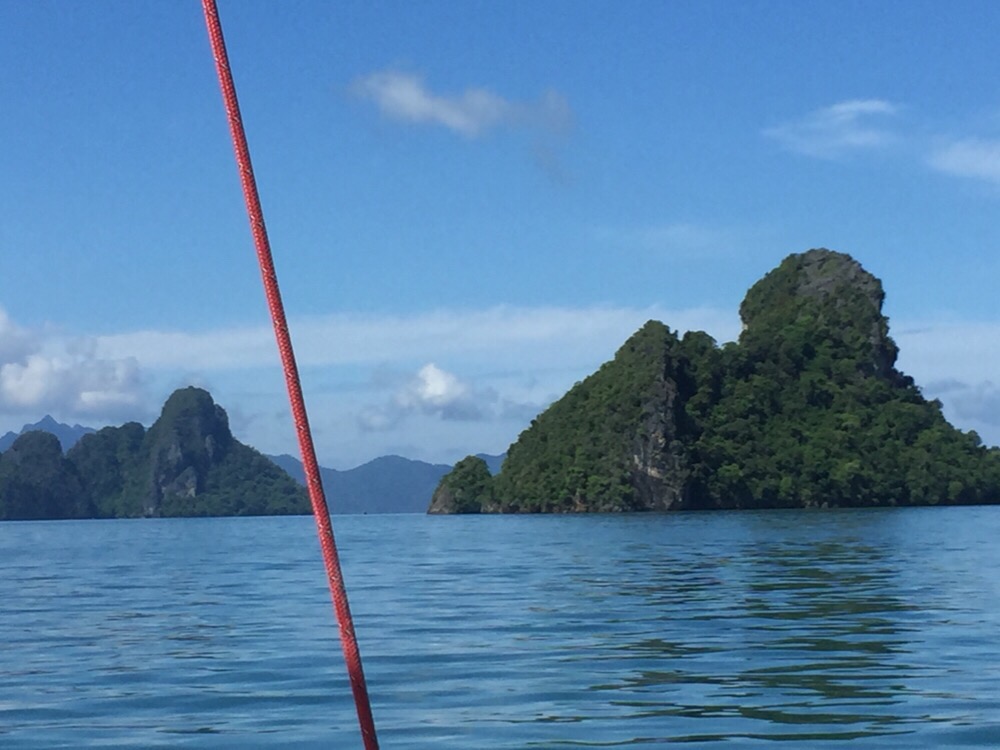 The next day was better and we had a good sail in big seas to Koh Muk. We were looking forward to going ashore there and around 5.30 headed into the beach on our dinghy. We were less than half way there when the wind started to get up, the grey clouds above us started to look angry and a low growl of thunder rolled around us.
