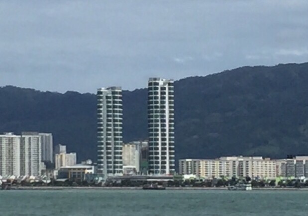 The curiously shaped towers where we stayed during our last visit to PenangAlthough we have sailed under them before, and the height of the span of both bridges is over 25 metres and our mast height is a mere 18 metres, it was still quite nerve wracking and I’m sure we both ducked as we sailed under.