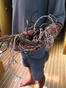 Argggh! More stuff on our prop! Occupational hazard in SE AsiaWhen the diver surfaced he told us that as well as a thick crop of barnacles he had found a whole heap of rope, twine and fishing net wound round the prop.