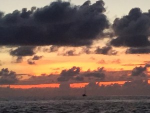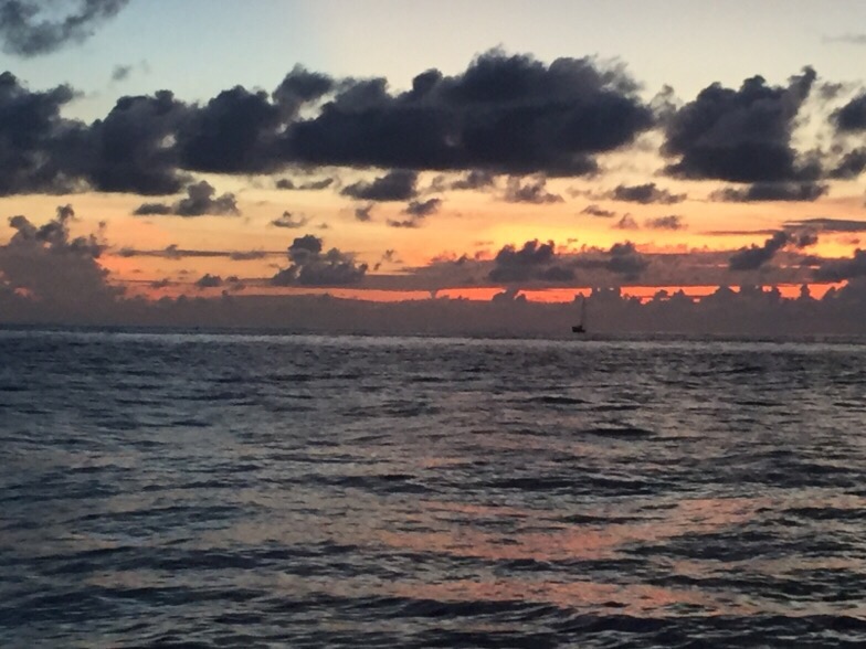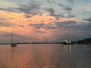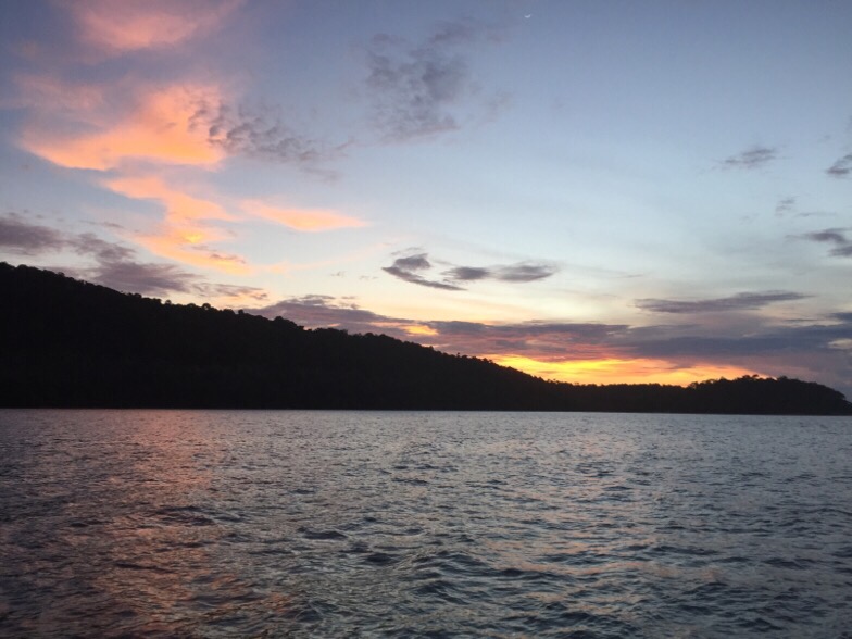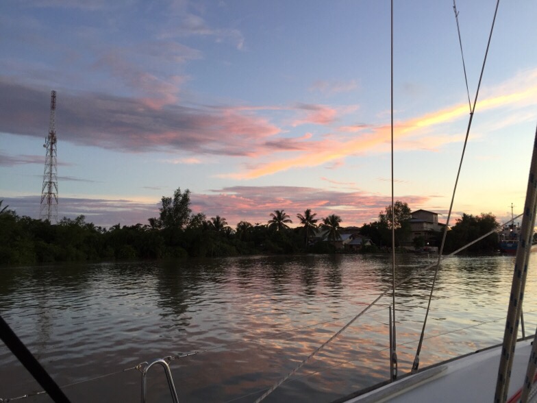 Our last sunset in the Tambelan IslandsAfter a short doze in the cockpit Yantara and Bali Hai pulled our anchors up at 11 pm so we could arrive in Sambas, West Kalimantan, on a rising tide.