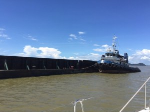 The stationery barge and tugWe motored passed a stationary tug and barge at one point – we think they were waiting for high tide to make their way out of the shallow river mouth.