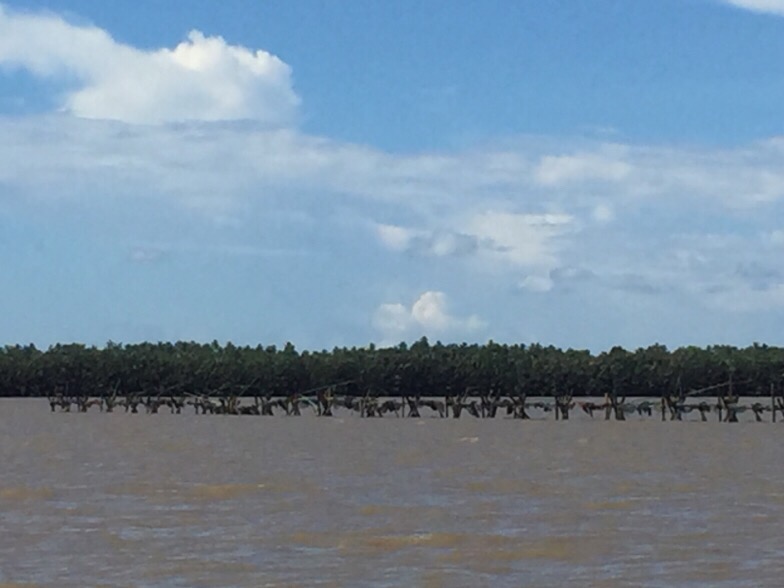 An hour later we were still going, having passed the town of Sambas (we later learned) and arrived at the anchorage where there were all sorts of fishing devices and traps in the water.