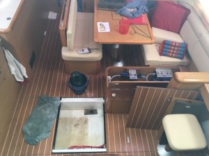 We were motoring along quite happily when all of sudden there was a loud clunk which seemed to come from the propellor shaft. Instinct told me to check for water ingress and I quickly lifted one of the hatch covers to discover much to our horror that in the few moments it had taken me to go down below, the bilges were already sloshing with seawater.
