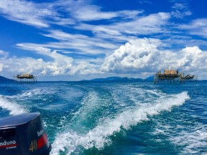 Kicking up quite a wake in the Marine Police launch with the fishing huts in the distance