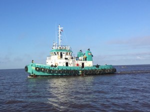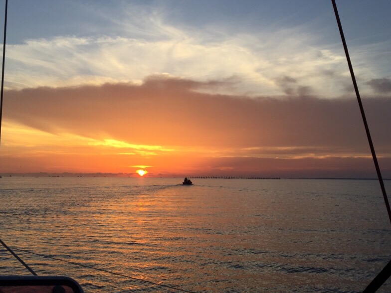 A small drink to celebrate becoming a Shellback or Daughter of NeptuneIt was quite a long trip so by the time we arrived it was early evening. There was a lot of river traffic including large barges being pulled by colourful (and sometimes matching) tugs.